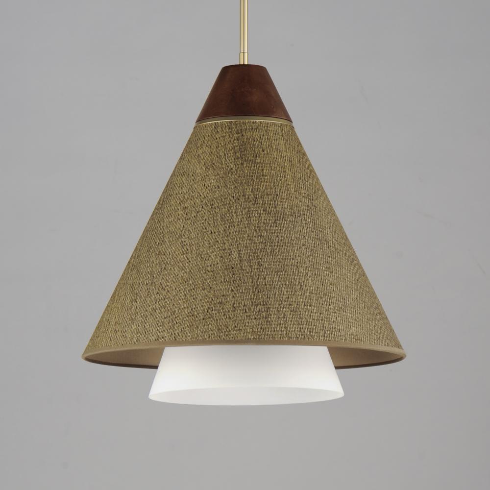 Stained Grass cloth shades are stitched with corresponding laces and suspended from solid wood housings trimmed with Natural Aged Brass. The combination of finishes and materials makes for a rich interpretation of the Coastal lighting trend and transports