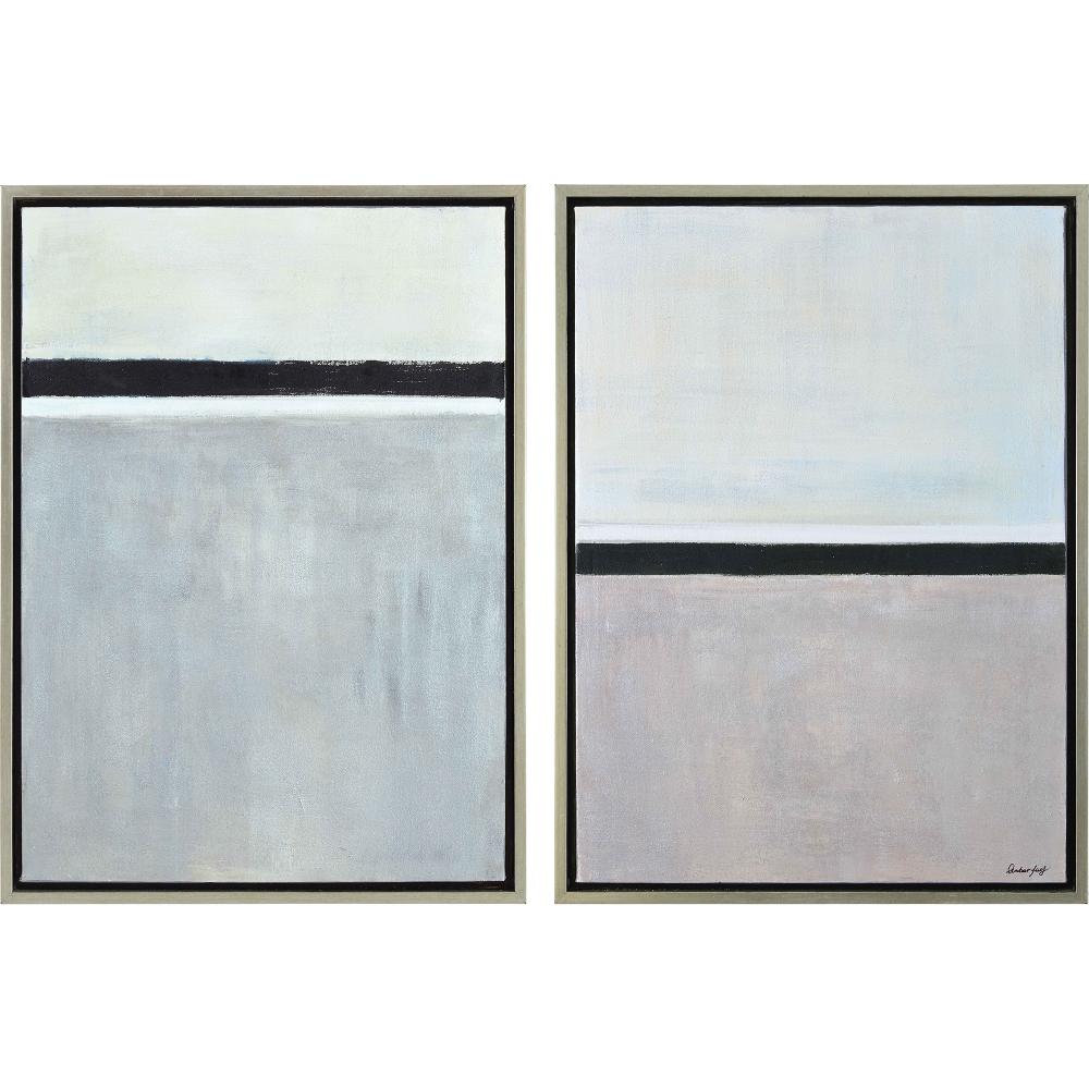 Modern interior walls call for the abstract stripe and square pattern in this set of two paintings on canvas. The graphic design of the contemporary artwork features creative color blocking in neutral shades of gray, black and white, accentuated by an argent silver frame. Mounted vertically or horizontally to shift the direction of the stripes, the versatile artwork offers endless possibilities for decorative arrangement.