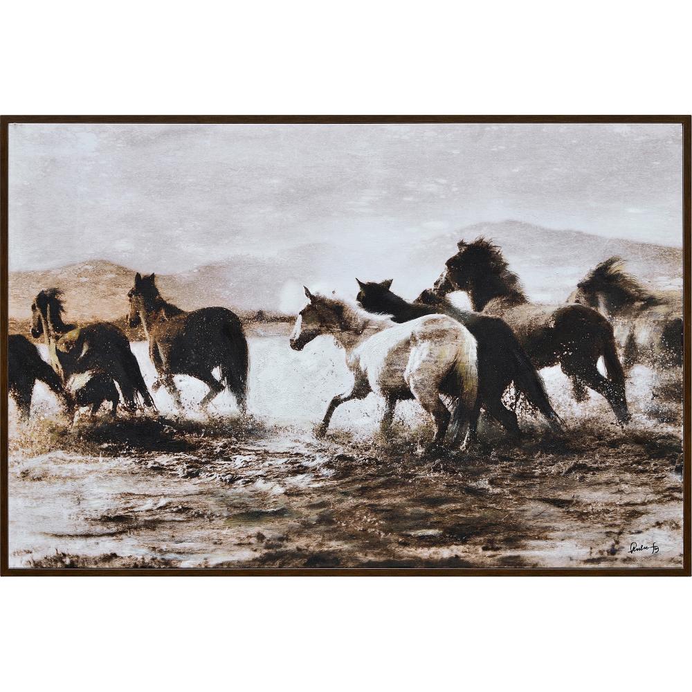 The rush and rhythm of racing horses leaps out from this cotton canvas painting and fills the rustic chic living space with fervor and energy. Thanks to its minimal palette of neutral tones, the captivating details of its subjects have ample opportunity to shine. Styled with neutral solid toned walls and accessories, it becomes the core piece that others build off of.