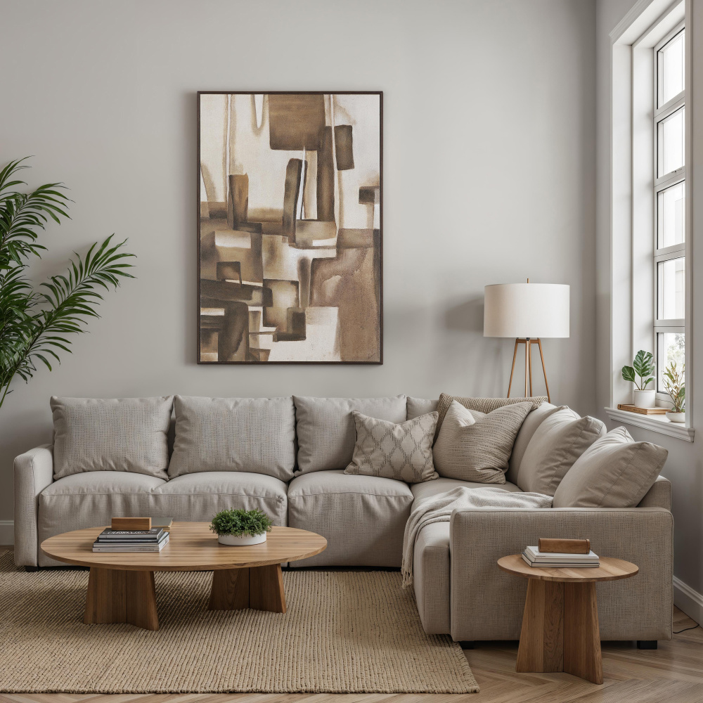 A study in transparency and layering, this abstract painting has a collage-like vibe achieved with paint and texture. Hand painted on high-quality linen, warm shades of brown impart a cozy feel in any space lucky enough to have it. Finishing off the high-end look, a black oak frame gives it gallery appeal and lets you skip the frame shop.