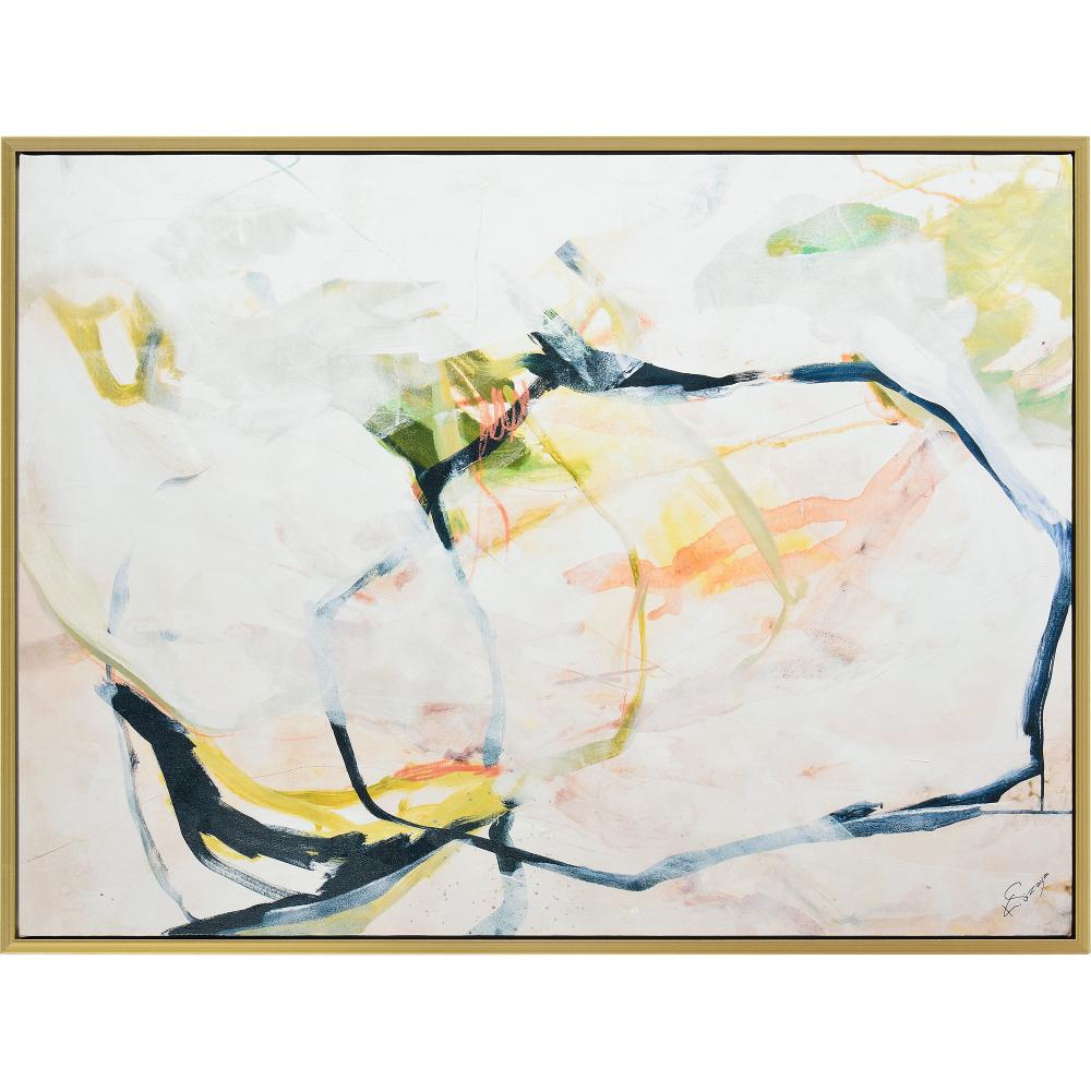 Green, blue, and pink brush strokes intertwine to create a playful, yet polished piece of printed art. Equally suited for the contemporary and mid-century modern interior, its colorful palette allows all other elements of the room to pop. Hanging horizontally or vertically, the champagne frame only enhances its versatility.