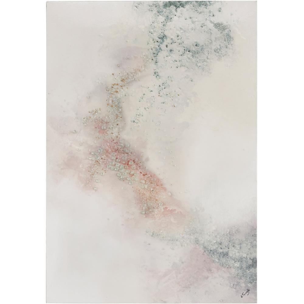 Swirls of pink and green collide and combine in this canvas artwork. Part printed, part hand-painted, the expansive piece is reminiscent of a rich marble slab. Set within the living space or bedroom, its glass and high gloss details bring a touch of sparkle to the space whether hung vertically or horizontally.