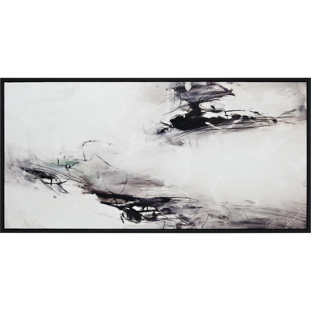 The imagination is let loose when taking in the abstract design of this work of art. The black strokes are at once bold and delicate, creating a story against the grey background of the piece. A black frame allows the details to pop even further, particularly when hung either vertically or horizontally within the modern interior.