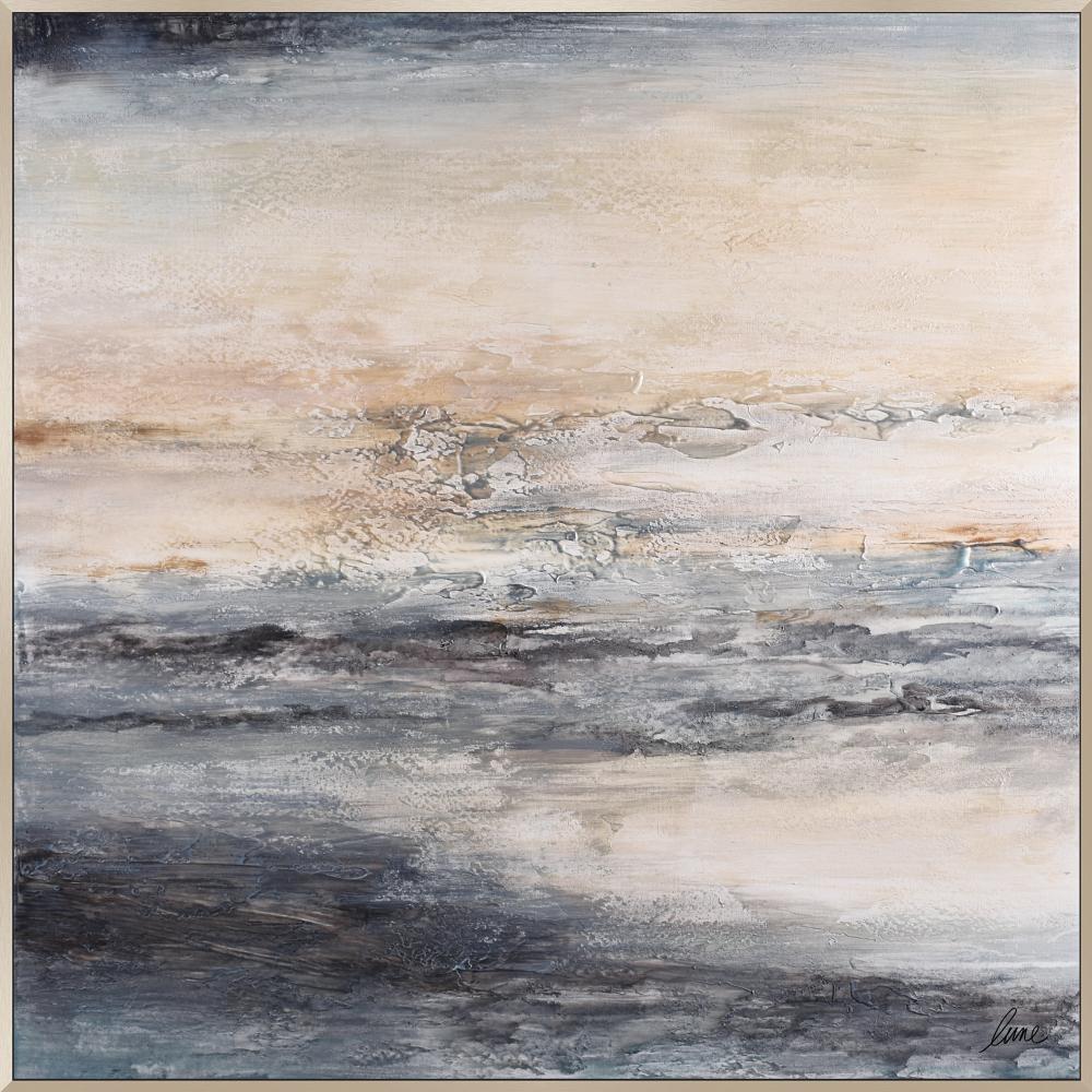 Endless possibilities are on the horizon with this abstract painting. Hand painted on a canvas with texture and movement, this piece add intrigue to the living room space. The floating champagne frame blend seamlessly with any colour scheme.