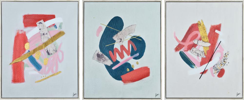 Creative lines and bold strokes set this trio of hand painted canvases with collage details apart. The rich colour scheme pops when set on a neutral wall. The off-white floating frames look spectacular in a modern space.