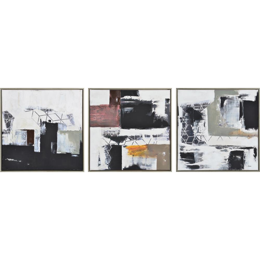 Abstract artistry fills the contemporary living room with this series of oil paintings. Set against a cotton canvas, the strokes of gold, black and grey pop effortlessly. One hundred percent hand painted with textured details adding an elevated touch, this framed set goes above and beyond the standard work of art.