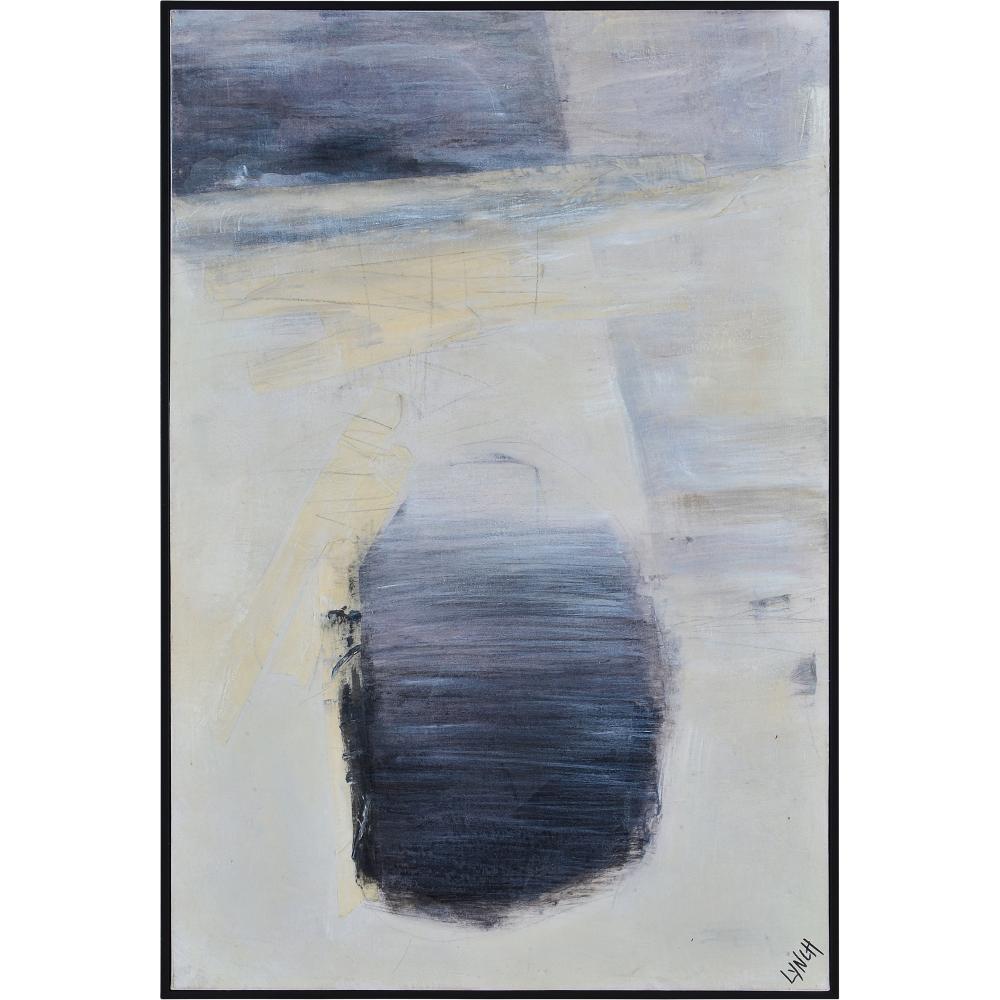 Artistic flair is eminent with this hand painted canvas with collage elements. The abstract deign is well suited for the living room or office spaces. Framed in black, it captures the eye and draws the viewer in.