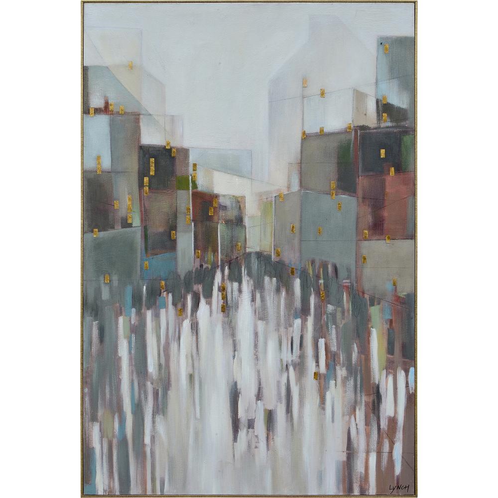 A set of two cotton canvas paintings allows for the classic interior to absorb the picturesque vision of a seaside landscape. A myriad of deep dark greys, soft pale blues, warm rosy tones, and gold leaf details, this work of art strikes the ideal balance of complexity and cohesiveness. Whether contrasted by bold dark paint tones or highlighted by stark white, it can't help but create the tone for the space.