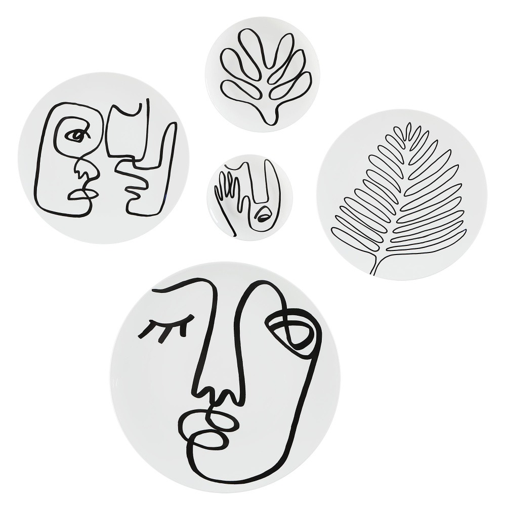 Playful and polished, these ceramic wall decor plates are an optimal fit for the client looking for a unique way to bring art into their dining or living room. Each of the five plates has its own unique design, ranging from modern portraits to leaves, but when hung together, the impact is entirely cohesive. The varying sizes of these wall decor pieces allow a homeowner to inject dimension into a simple space.