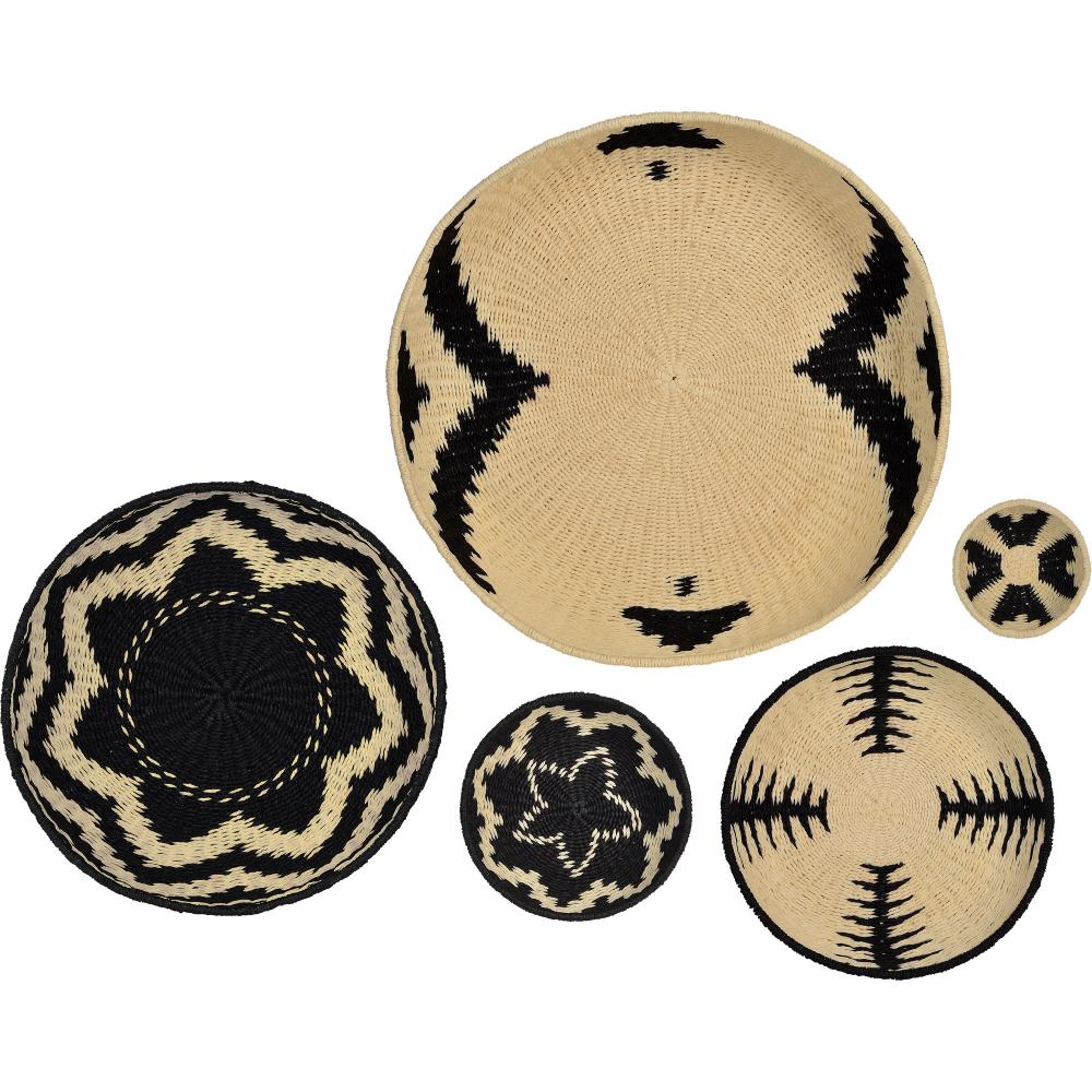 Cream and black tribal inspired baskets give your home a well-traveled look. The five seagrass hanging baskets are in various sizes for a collected feel. Hang in a cluster in the dining room against a neutrally painted wall for the biggest impact.