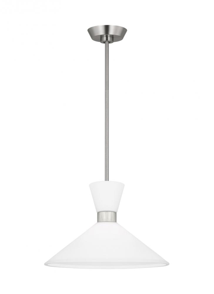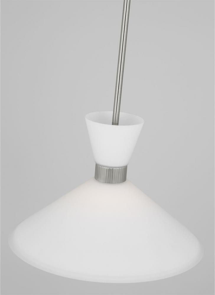 Inspired by playful mid-century modern design, the Drew & Jonathan Belcarra Medium Pendant is accentuated by a flared glass shade with ribbed metal details and etched white glass that bestows an almost whimsical touch to the clean design. Available in three finishes, Brushed Steel, Midnight Black, and Satin Brass, the Belcarra looks great on its own or when grouped in multiples. This product may be mounted on a sloped ceiling and is cETL listed for damp locations, making it the perfect lighting solution for any space.
