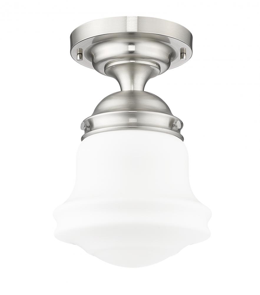 Upgrade home lighting with a modern one-light flush mount ceiling light with vintage inspirations. Borrowing from Mid-Century motifs, it boasts matte opal schoolhouse glass to complement a decorative mounting in a versatile brushed nickel finish. Perfect for a walk-in closet, powder, room, bedroom, and beyond.