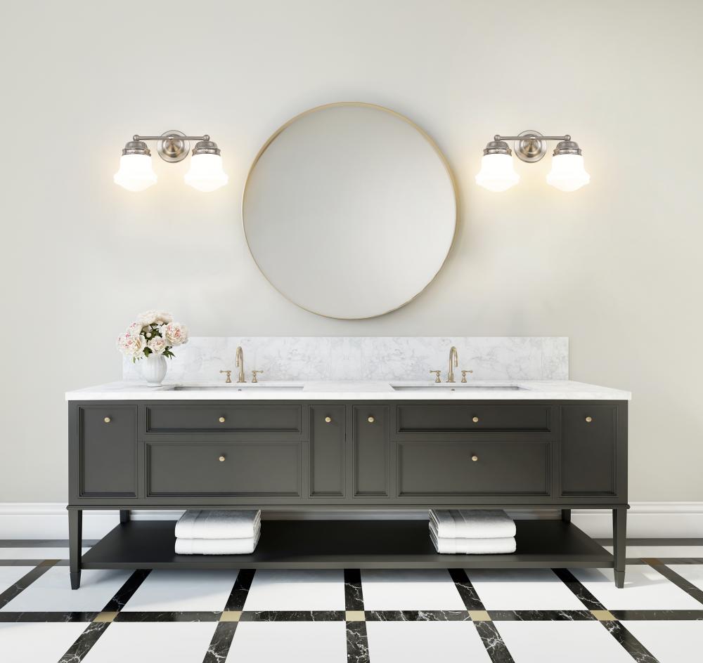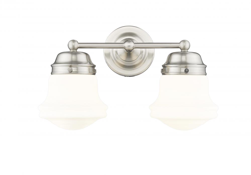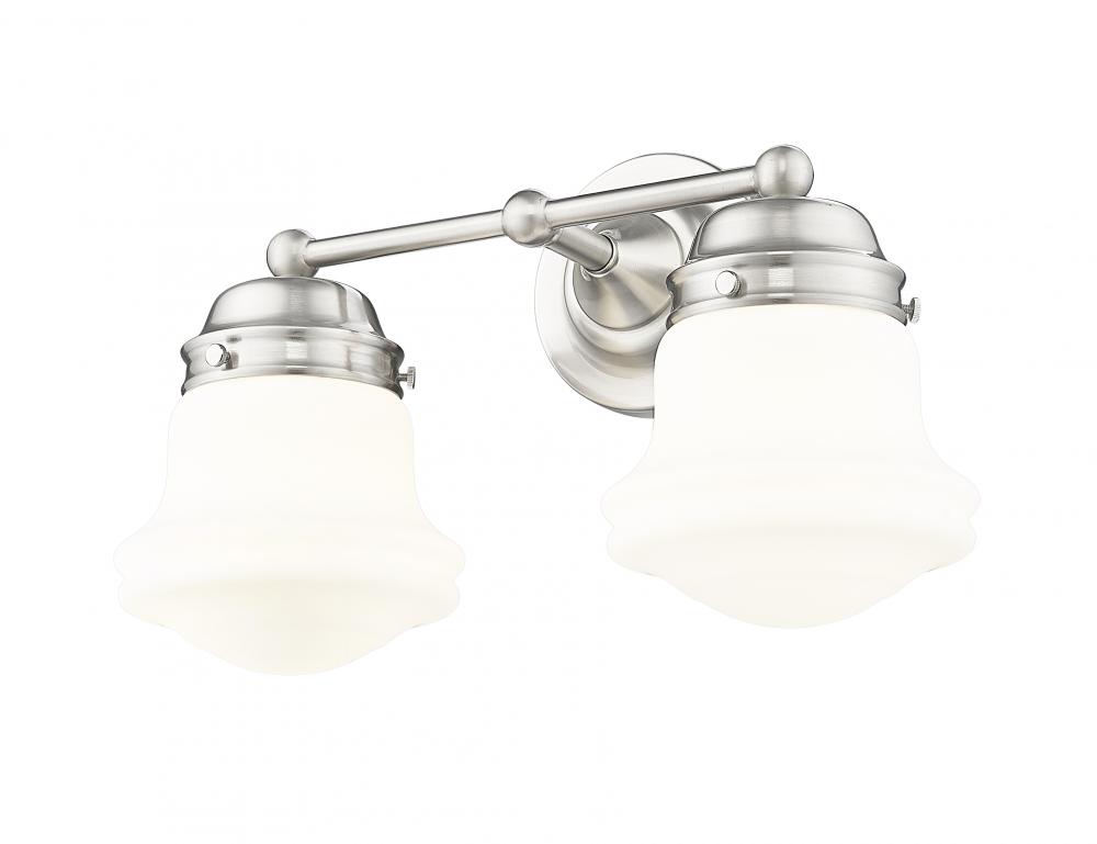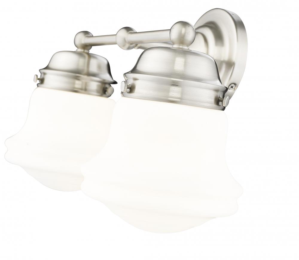 A perfect choice flanking a vanity or in a dressing area, this modern two-light wall sconce showcases Mid-Century Modern character. Schoolhouse-style glass overflows with personality, offering both vintage aesthetics and lovely, diffused illumination. The fixture is defined with a bright brushed nickel finish that complements in virtually any home.